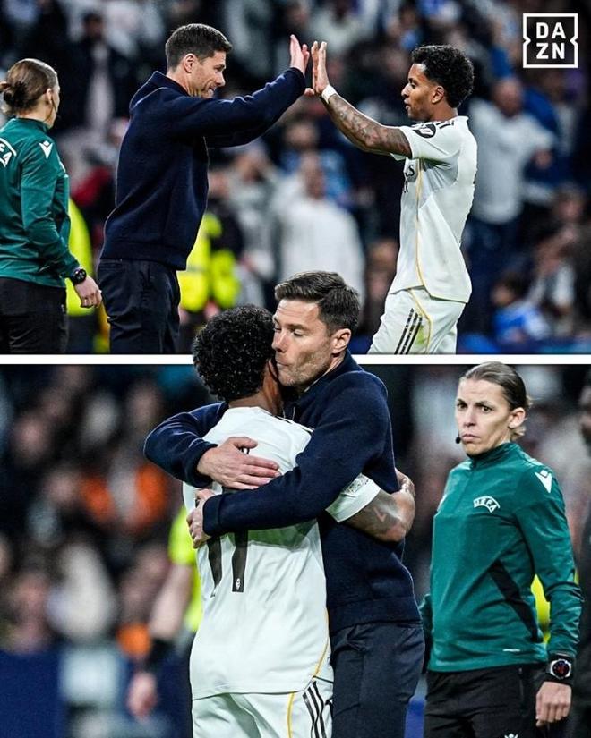 我相信阿隆索并不是看不到罗德里戈的能力,但他只是有他现在还很幼稚的坚持,就像年轻的安切洛蒂不想用前腰球员,所以不想用巴乔类似,那就是右路最好还是能用左脚球员,那么在左路,你就不可能因此让维尼修斯坐稳替补席了。